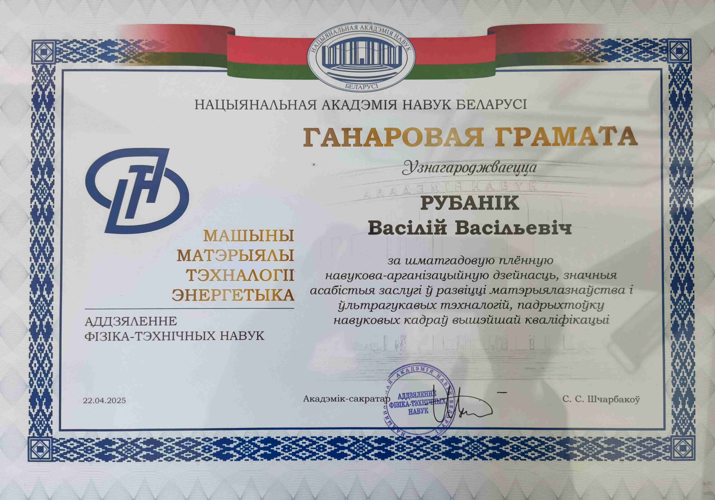 Академик-секретарь отделения физико-технических наук НАН Беларуси, доктор физико-математических наук, профессор Щербаков С.С. вручил 7 октября 2025 г. Почетную грамоту отделения физико-технических наук НАН Беларуси заведующему отделом ультразвуковых технологий – заведующему лабораторией физики металлов ИТА НАН Беларуси, доктору технических наук, профессору, члену-корреспонденту НАН Беларуси Рубанику В.В.